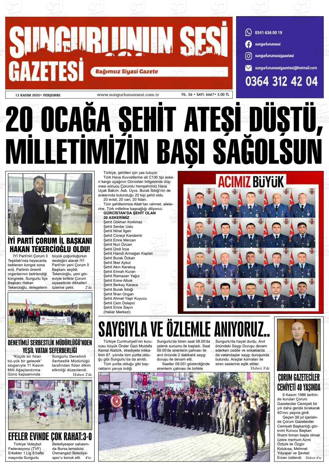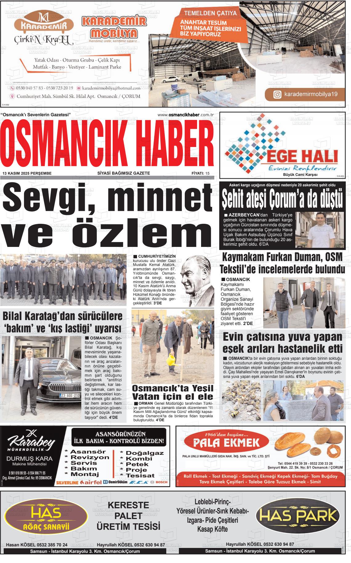 Çorum Yerel Gazeteleri 13 Kasım 2025, Perşembe Günü Manşeti