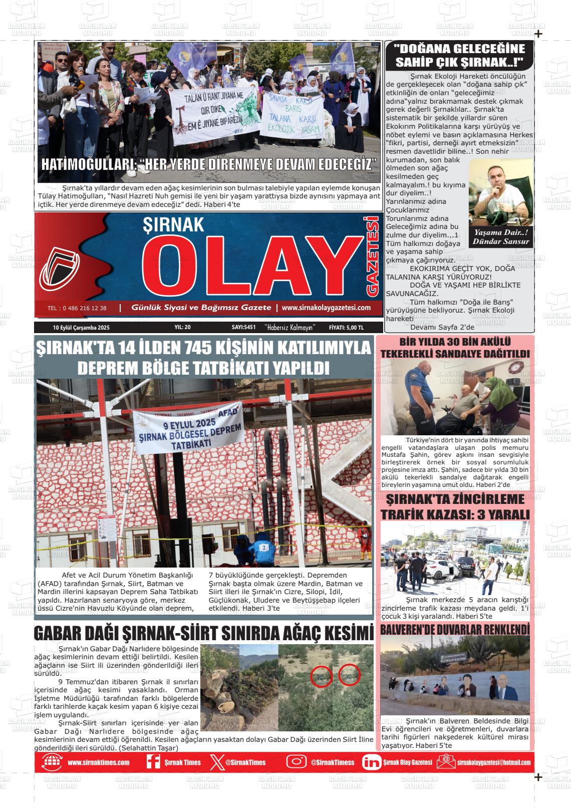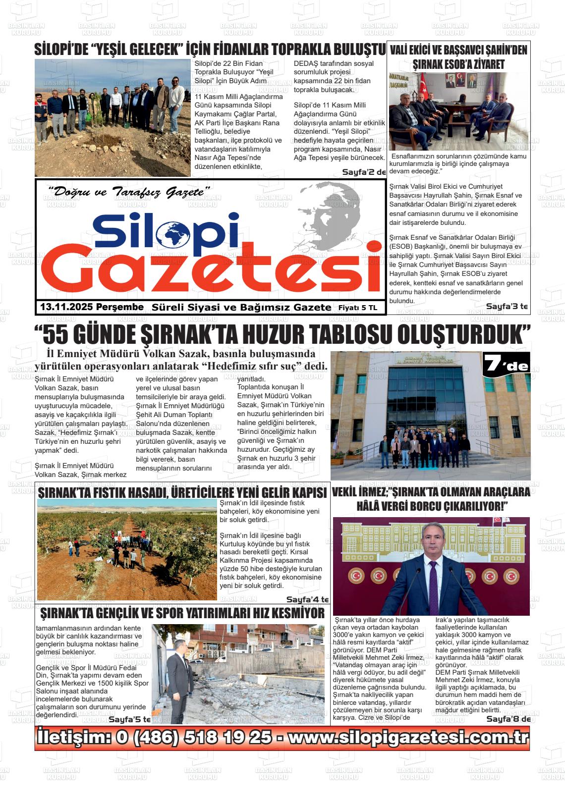 Şırnak Yerel Gazeteleri 13 Kasım 2025, Perşembe Günü Manşeti