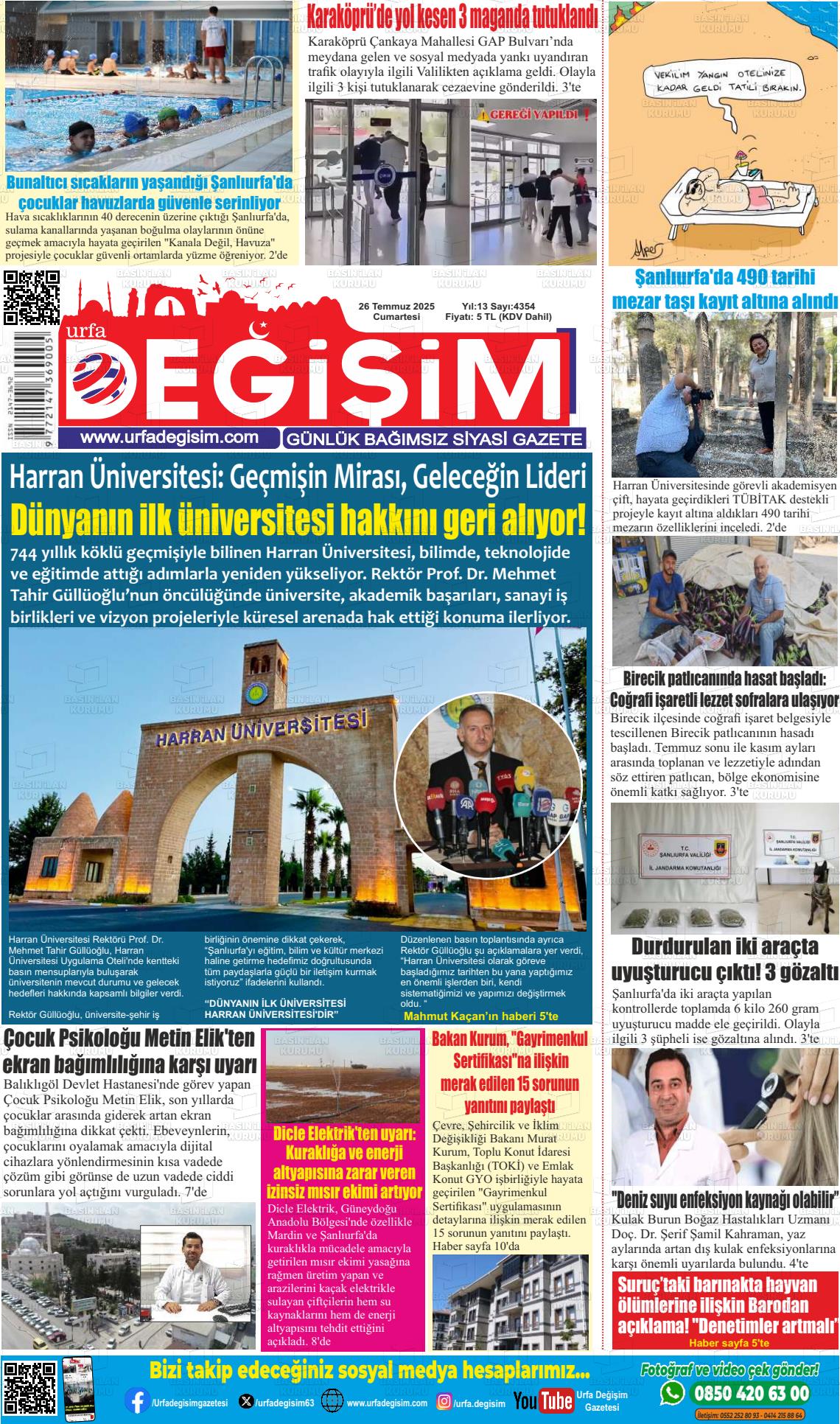 Şanlıurfa Yerel Gazeteleri 13 Kasım 2025, Perşembe Günü Manşeti