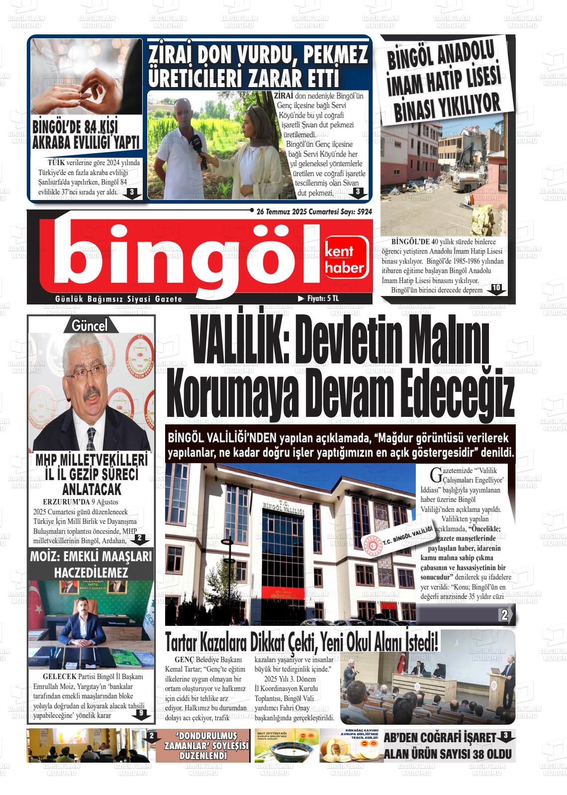 Bİngöl Yerel Gazeteleri 13 Kasım 2025, Perşembe Günü Manşeti