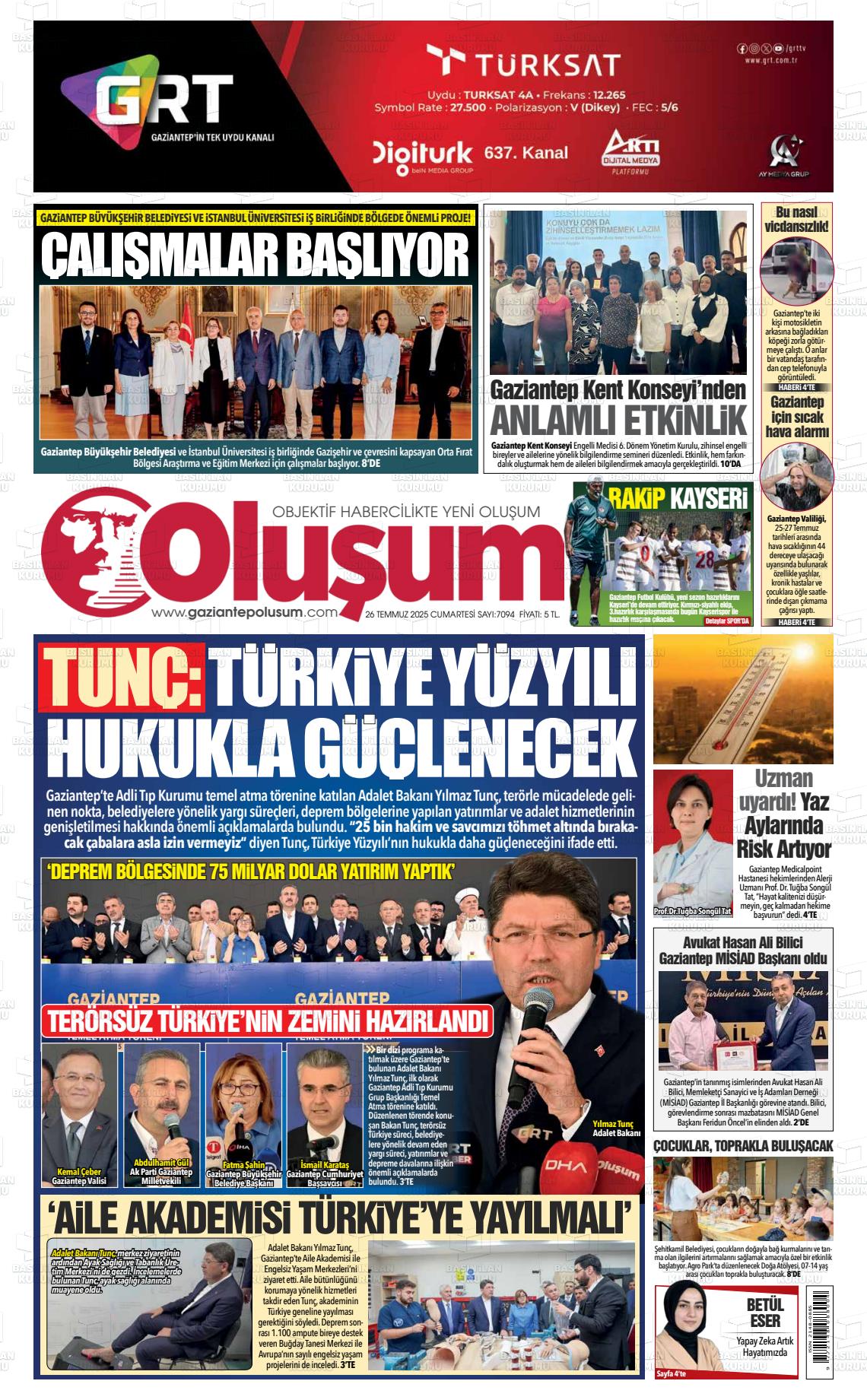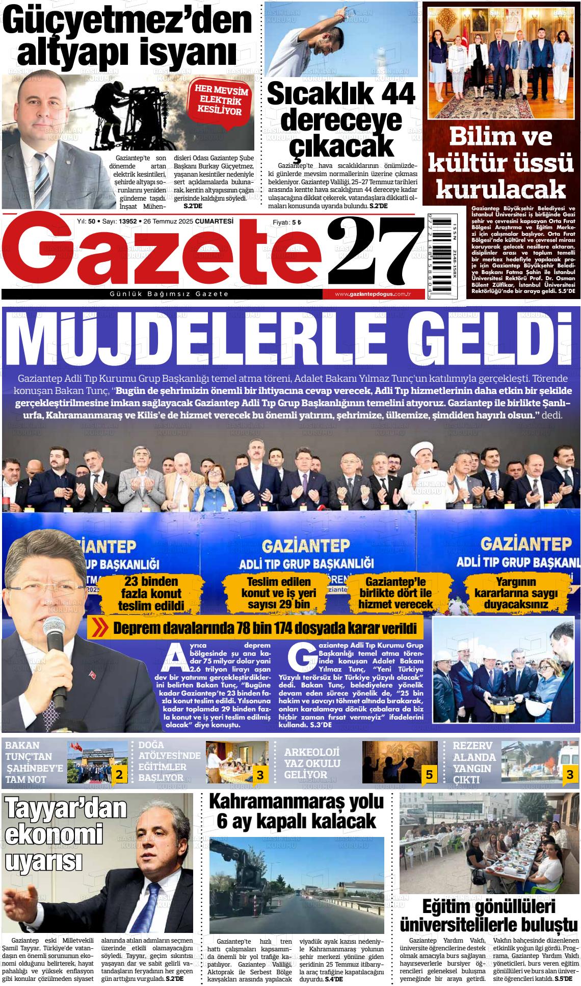 Gazİantep Yerel Gazeteleri 13 Kasım 2025, Perşembe Günü Manşeti