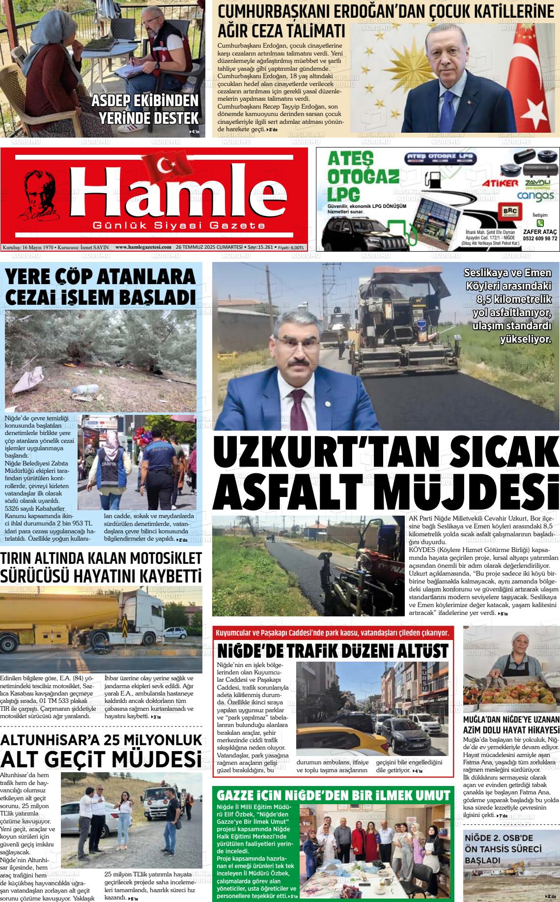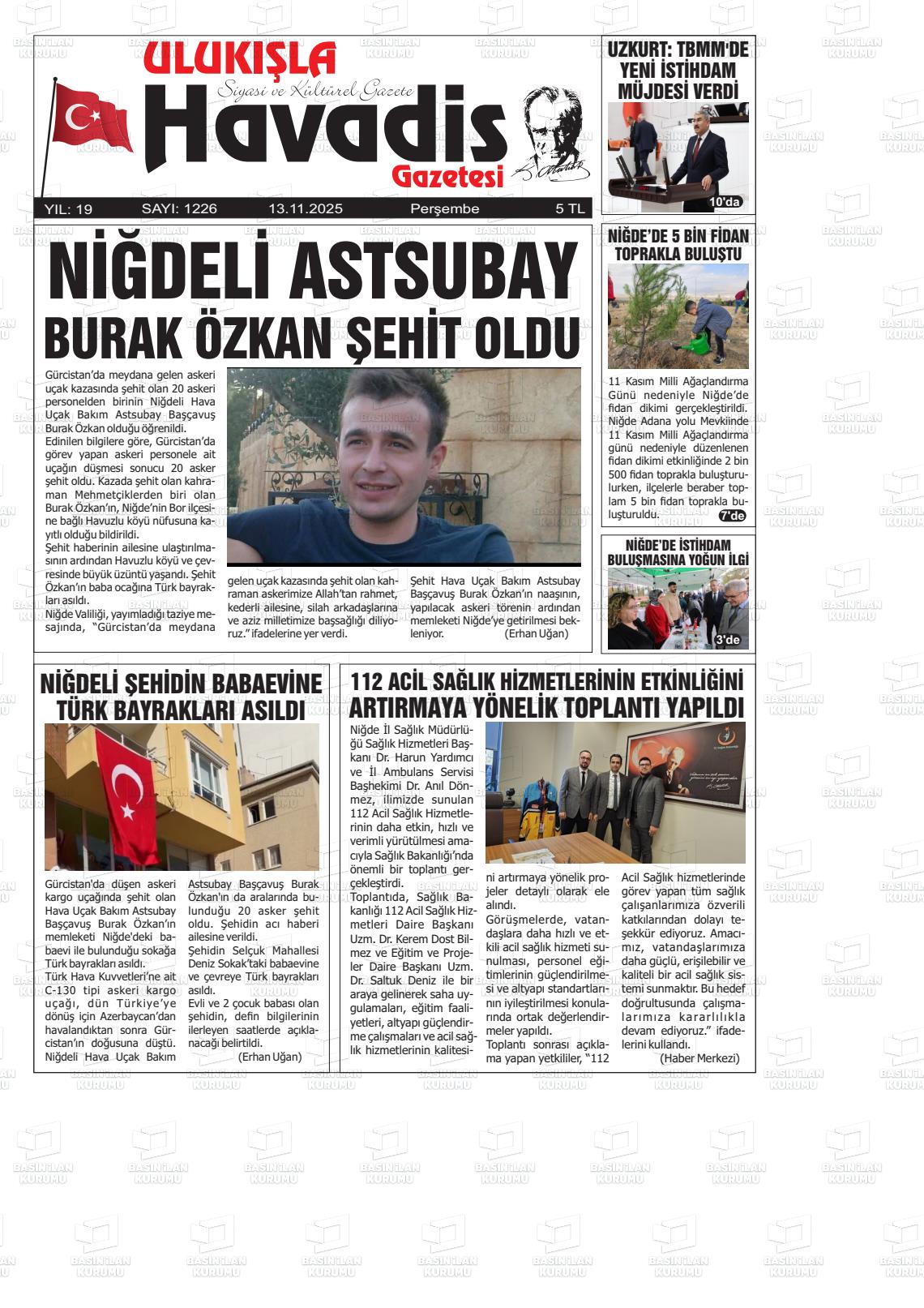 Nİğde Yerel Gazeteleri 13 Kasım 2025, Perşembe Günü Manşeti