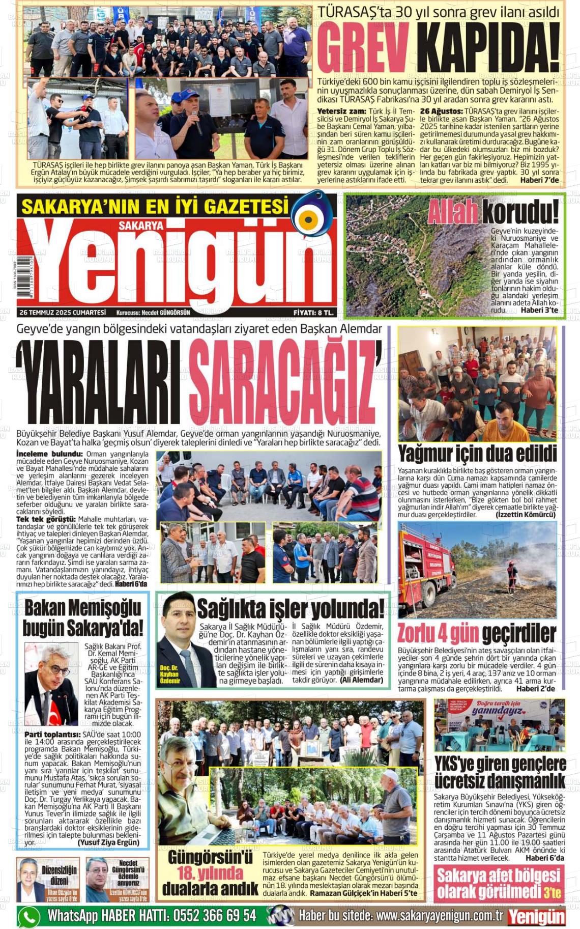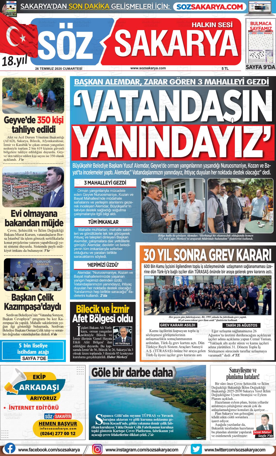 Sakarya Yerel Gazeteleri 13 Kasım 2025, Perşembe Günü Manşeti