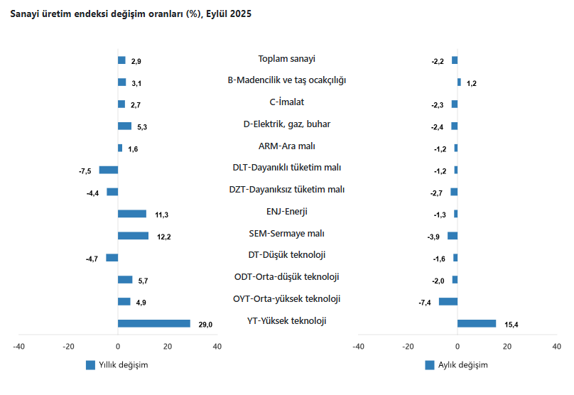 Sanayinin alt sektörleri incelendiğinde, 2025 yılı Eylül ayında madencilik ve taş ocakçılığı sektörü endeksi bir önceki aya göre yüzde 1,2 arttı, imalat sanayi sektörü endeksi yüzde 2,3 azaldı ve elektrik, gaz, buhar ve iklimlendirme üretimi ve dağıtımı sektörü endeksi yüzde 2,4 azaldı.